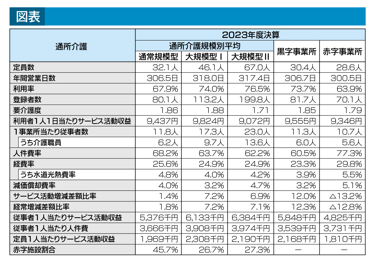 利用者1人1日当たりの事業収益は、基本型で1万1022円、在宅強化型では1万1405円となっています。一方、通所介護の通常規模型は9,437円であり、単価の差は明確です(表)。