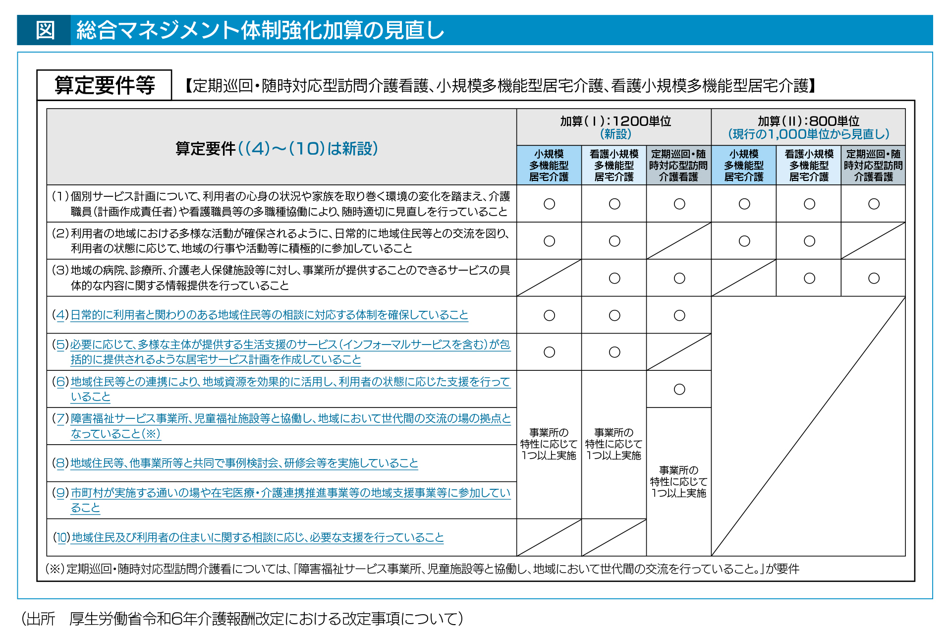 オペレーションの効率化のキーマンとなる職種は、介護支援専門員です。介護支援専門員は利用者の生活を最優先にケアプランを作成することはもちろんですが、同時に事業所全体の職員の動きの最適化を考えたうえで、ケアプランの微調整を図り、利用者へ説明していく必要があります。例えば職員の移動時間の短縮を図り生産性をあげていくためには、Aさんの訪問時間を1時間ずらすことにより、新規利用のBさんの訪問につながり、結果として移動時間の短縮が生じ、生産性向上につながっていくなどの細かな調整を図るなどです。また、泊りの回数の調整を行い、限りある設備を最大限有効活用することも重要な調整の一つです。連続して泊りを利用される利用者がいるため、新規の泊り希望の利用者は受け入れをストップしている、といったことは、中重度利用者を受け入れられないことにつながるため、避けていかなくてはいけません。また、新設の加算の取得も急ぎ体制を整えていくことが望ましいでしょう。各事業所の加算の算定率が上昇すると、基本報酬に含まれていく可能性があります。とくに令和6年度介護報酬改定で新設された総合マネジメント体制強化加算T(図参照)の算定は、地域密着型サービスの基本姿勢の徹底につながる要件でもあり、事業所の地域に根差す活動が問われている内容になっています。要件のなかにはインフォーマルサービスの活用がうたわれており、職員の関わりだけではない利用者支援が求められています。現在は65%超の事業所が算定しています。算定に至っていない事業所においては積極的に算定していくことを推奨します。