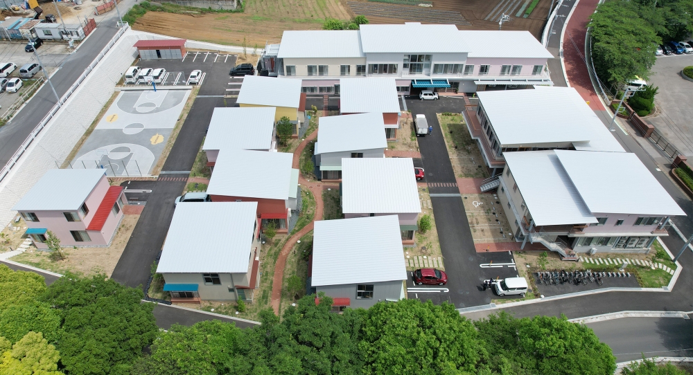 定員36人の児童養護施設は、1棟に6人のこどもが生活する2階建ての建物が6棟あり、それぞれの建物に玄関を設けることで自宅と変わらない生活環境を提供している。1階はリビング、ダイニングキッチン、浴室、トイレなどの共有スペースが入り、2階部分が居室となっている。居室は全室個室で兄弟・姉妹で入所する際には、仕切りを外して2人部屋として使用できる設計とした。
