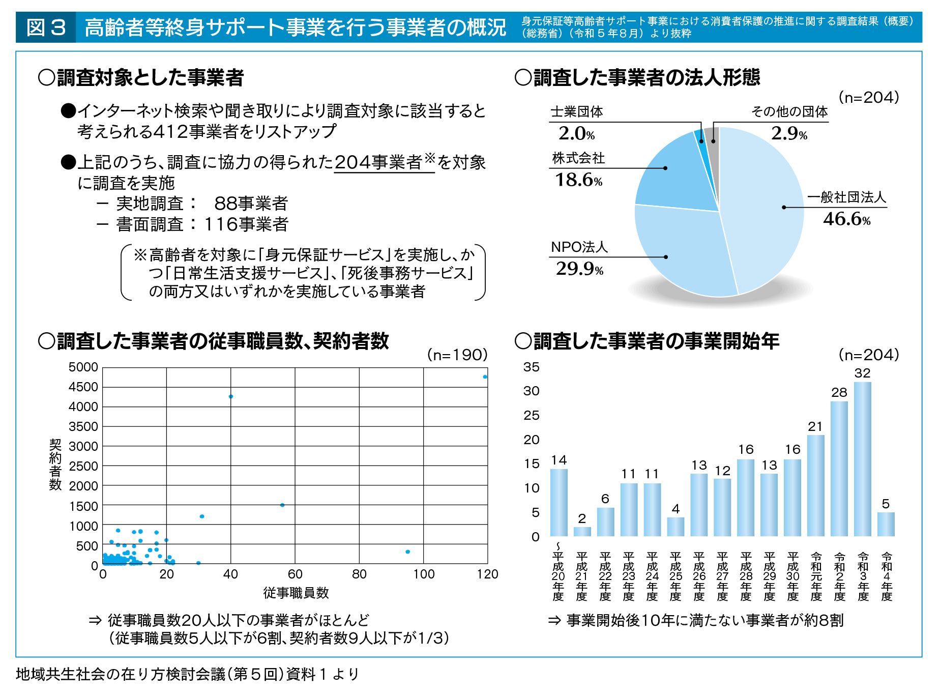 さらに、「高齢者等終身サポート事業」(図2)を行う事業者は、事業開始後10年に満たない事業者が約8割、従事職員数20人以下の事業者がほとんど(従事職員数5人以下が6割、契約者数9人以下が1/3)となっており(図3)、事業者の経営破綻に伴うトラブル等も発生していることから、消費者保護の側面からも事業運営の健全性・継続性が求められる。