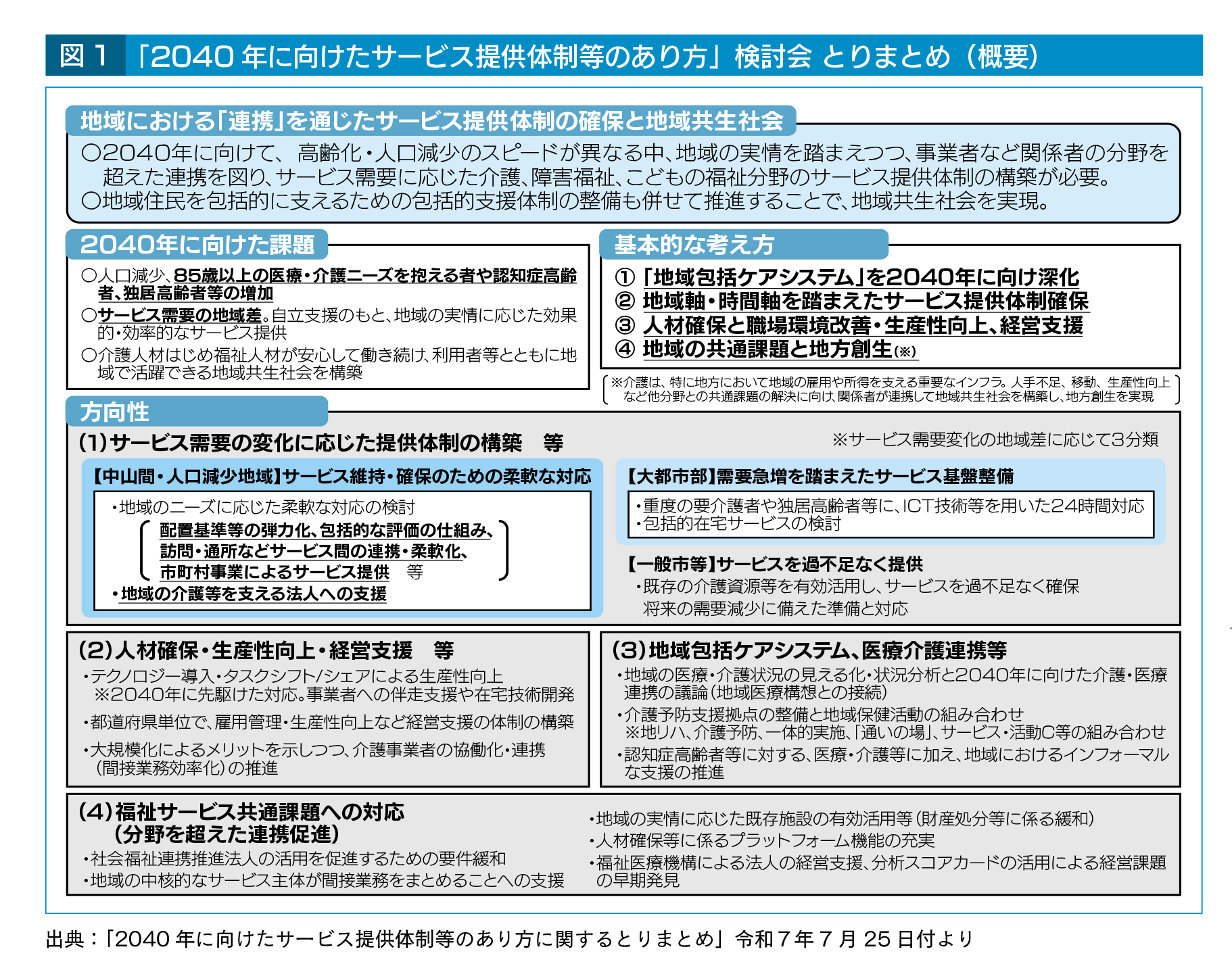 こうした状況を踏まえ、2025(令和7)年1月から「2040年に向けたサービス提供体制等のあり方」検討会において、地域軸・時間軸を踏まえつつ、高齢者に係る施策、その他(障害・児童等)のサービスも含めた共通課題について検討を進めてきた。その後、同年7月25日にとりまとめを公表した。