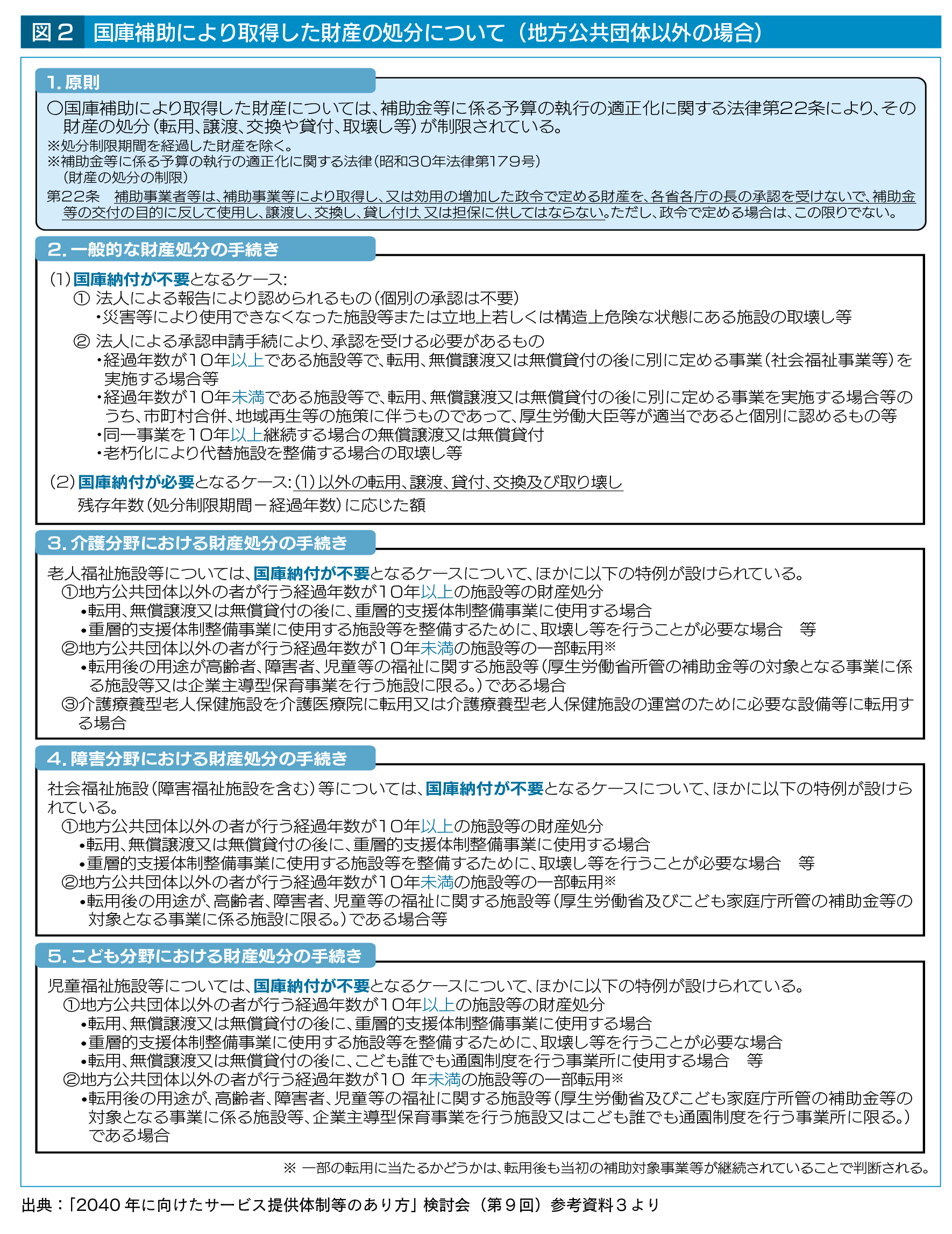 現行制度では、社会福祉法人、医療法人等が施設等の財産を取得した際に国庫補助がなされている場合、転用・貸付の後に社会福祉事業を行う場合であっても、財産取得から10年未満の転用の場合(補助対象事業を継続したうえで一部転用する等の場合を除く)等には、原則として補助金の国庫返納が必要となっている(図2参照)。