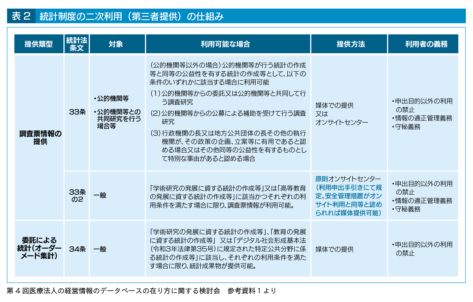 第三者提供制度は、@一般からの委託に応じて作成した統計を提供する仕組み(オーダーメード集計)と、Aデータベース上の医療法人情報そのものを研究者等に提供する仕組みの2つが医療法で規定されている。