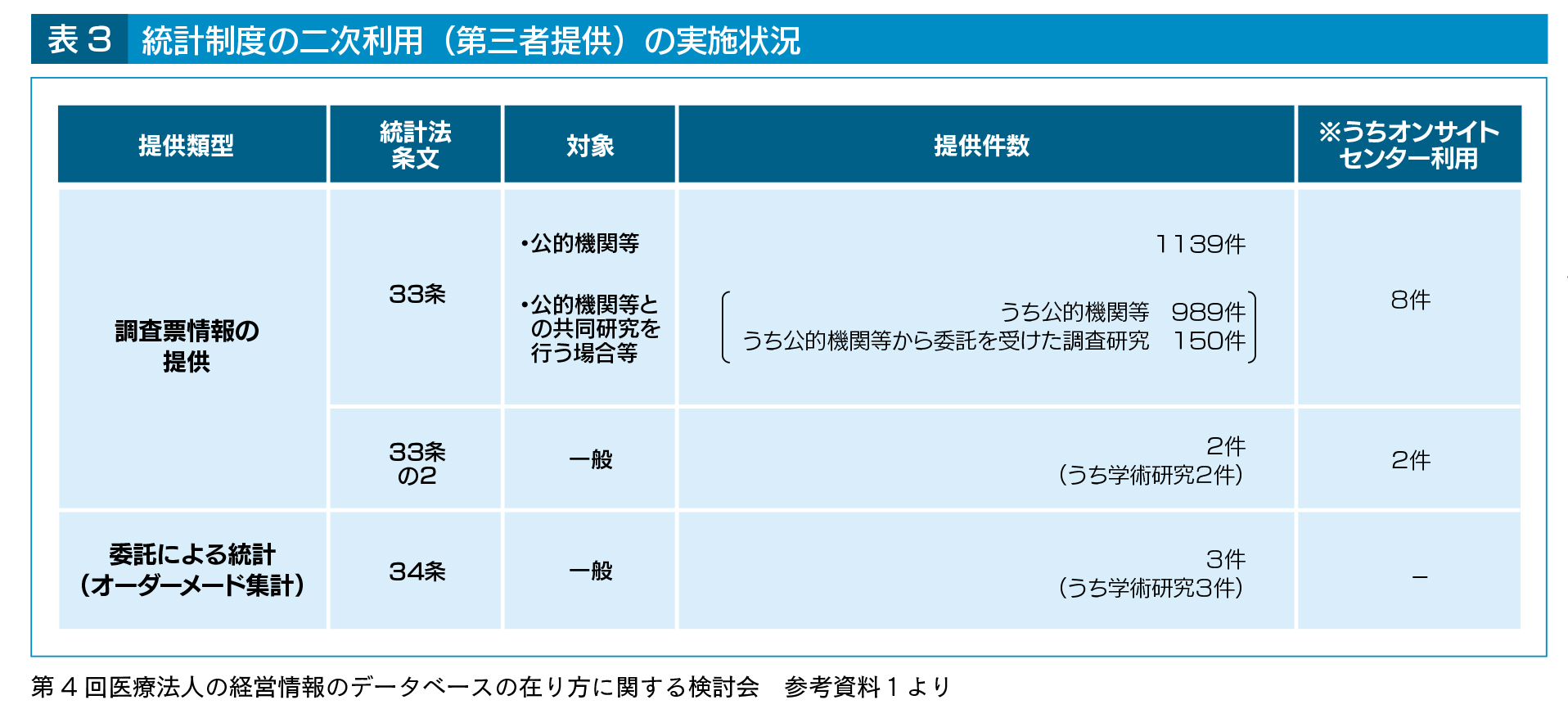 @のオーダーメード集計については、先行事例として、統計法においても規定されており、MCDBの第三者提供の申請手続きもこれにならって定めることが示されている。ちなみに、統計法における二次利用(第三者提供)については、公的機関等や公的機関等との共同研究を行う場合以外の申請者は、原則オンサイトセンター*2にて情報提供を受けることとなっている(表2)。また、これまでの提供数は表3のとおりとなっている。