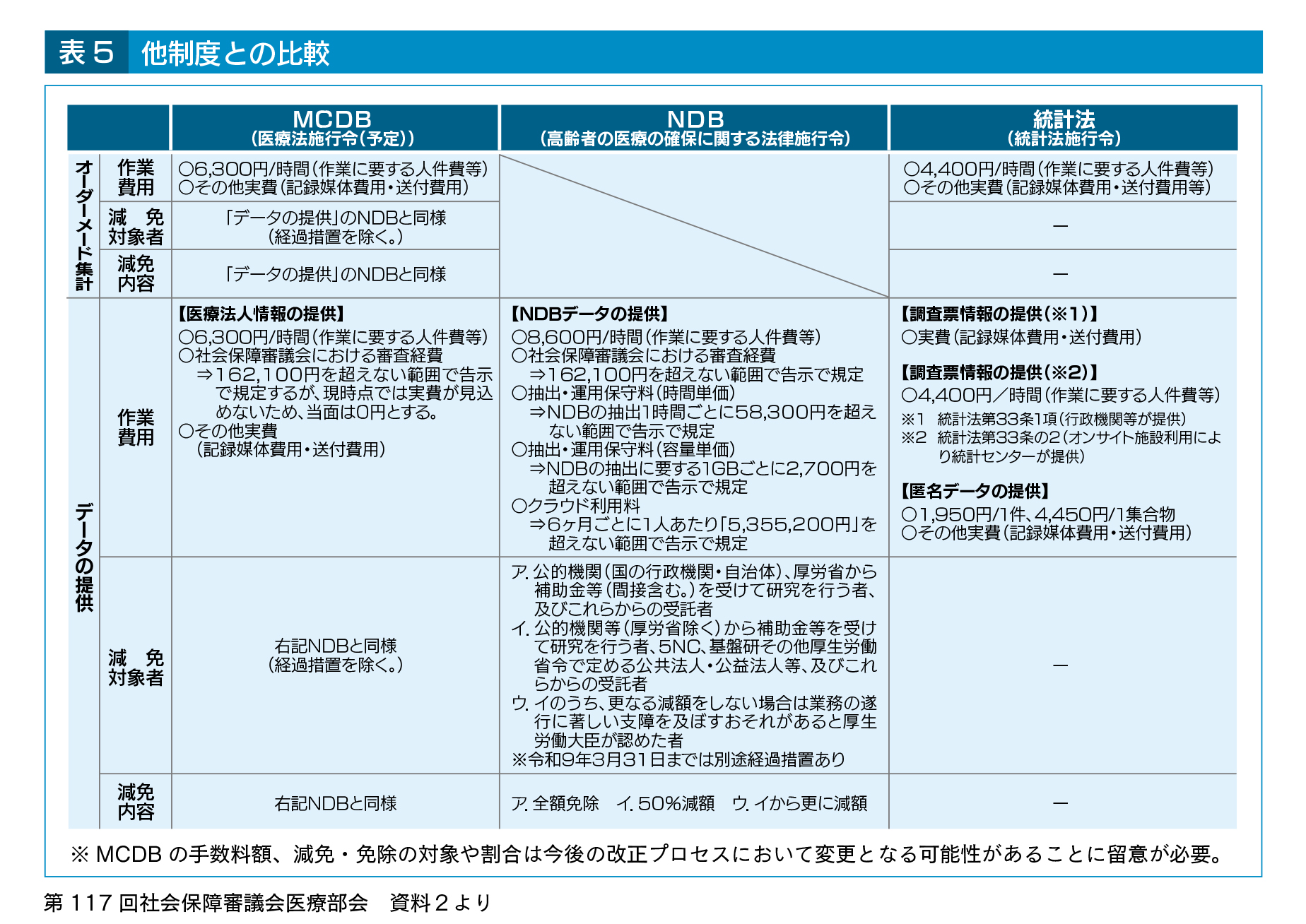第三者提供に係る手数料等についても、統計法とNDBにならい、表5のように定められる予定となっている。