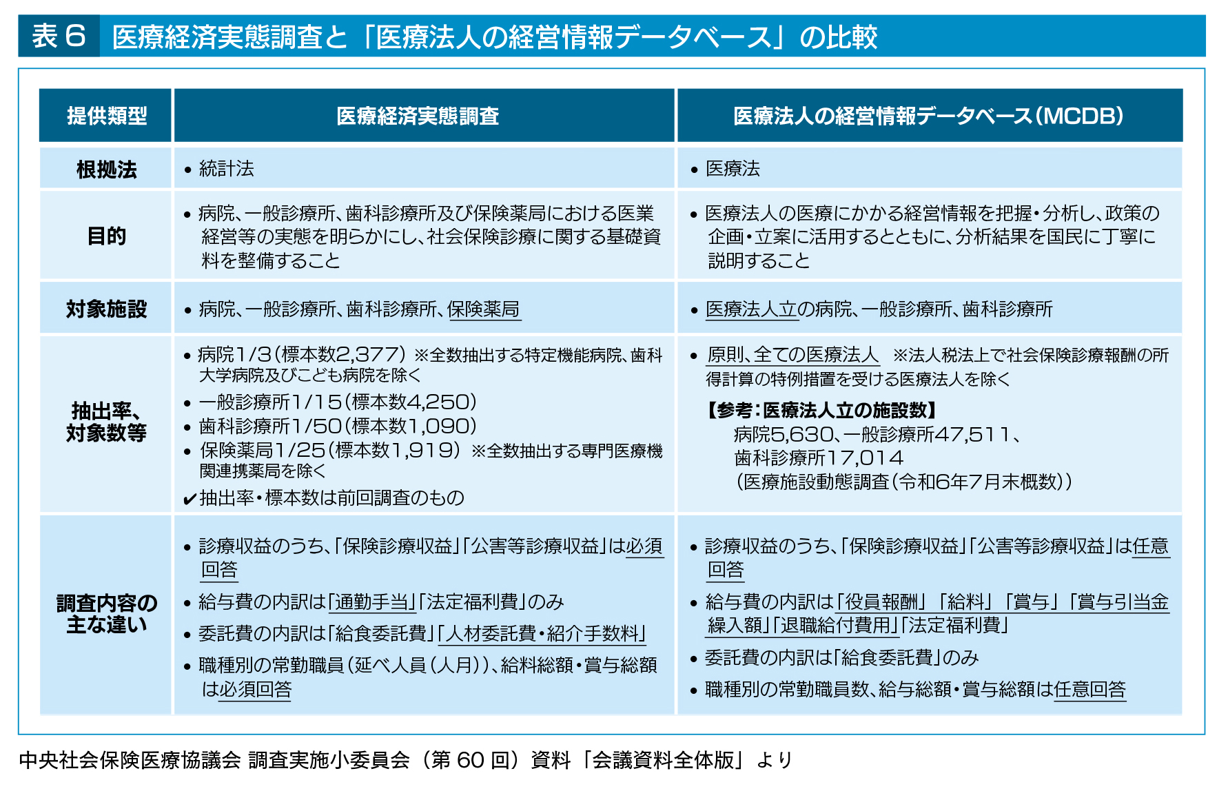 なお、診療報酬改定の基礎資料となる「医療経済実態調査」とMCDBでは医療機関の抽出数に差があり(表6)、中医協では、抽出数が多いMCDBについて改定を補完するものとすることが議論されるなど、MCDBはすでに医療法人の経営状況をより正確に政策に反映するためのツールとなっている。決算書提出の意義は大きいものとなっている。