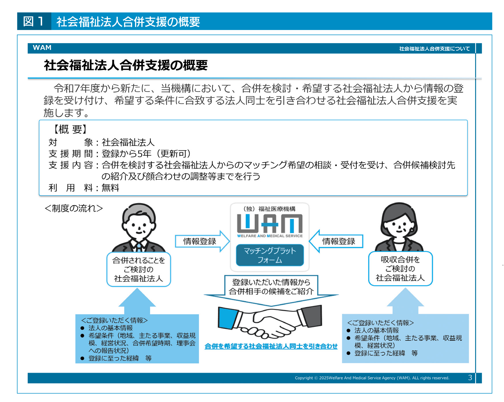 こうした経緯を踏まえ、福祉医療機構では2025(令和7)年度から、「社会福祉法人合併支援業務」を開始している(図1)。
