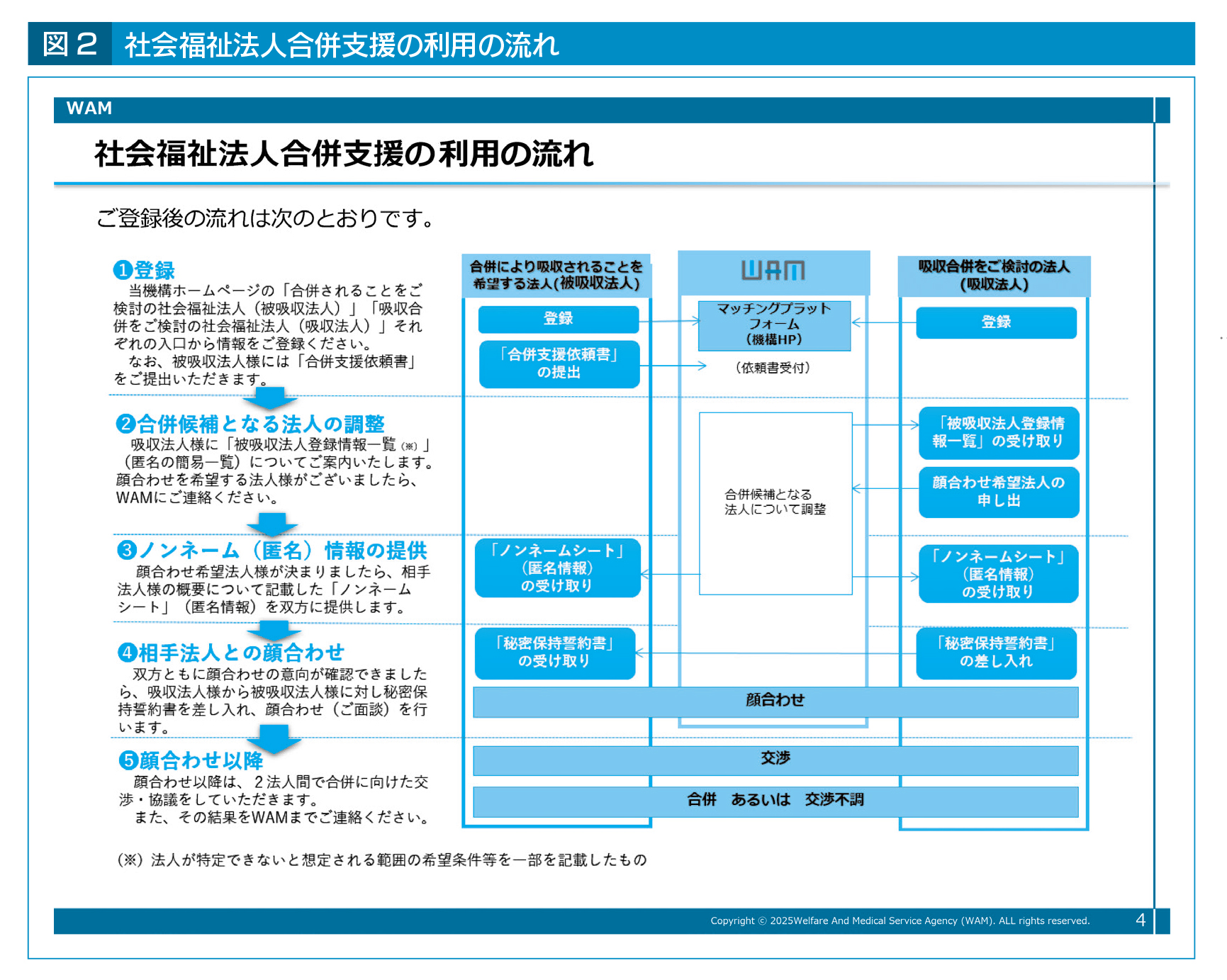 具体的には、合併を検討する社会福祉法人からのマッチング希望の相談・受付から、合併候補検討先の紹介と顔合わせの調整等までを行う(利用料は無料)。利用の流れは図2の通りとなっている。顔合わせ以降は、2法人間で合併に向けた交渉・協議を行うこととなる。