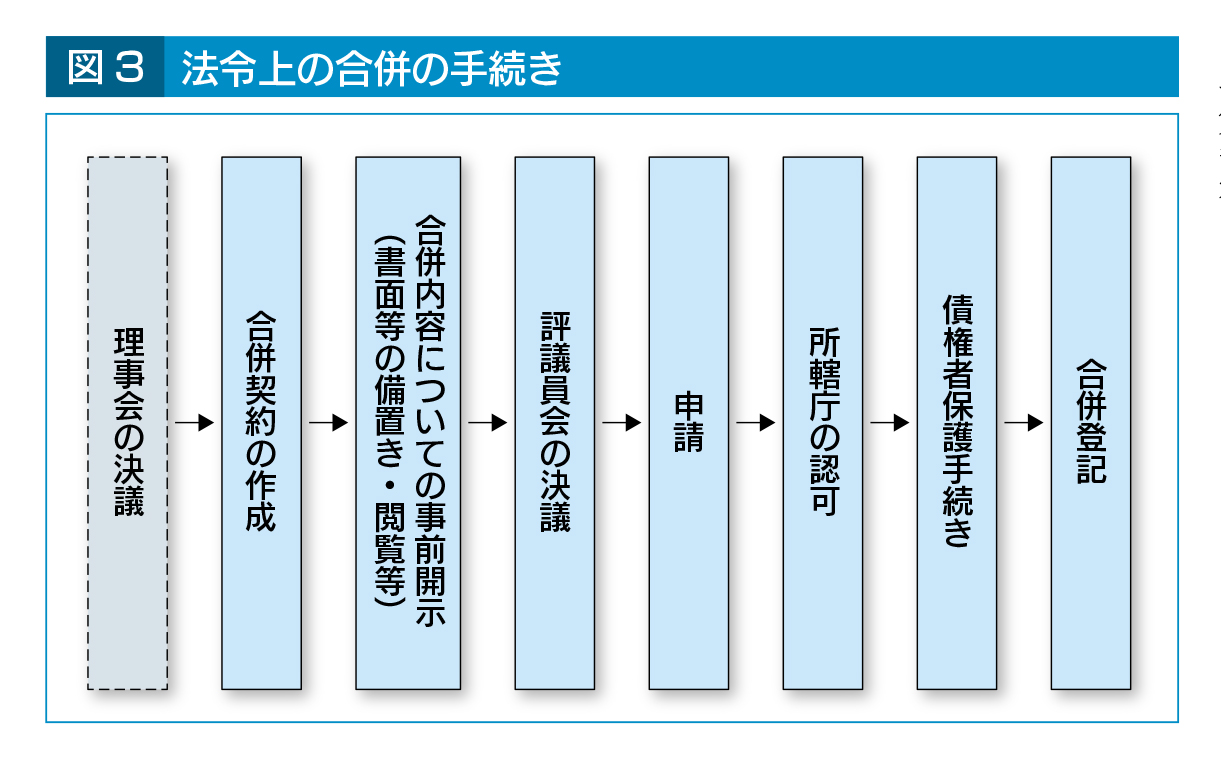なお、合併相手として相手方を評価するための調査(デューデリジェンス)、相手方との交渉や合併にかかる契約締結等の事務、手続きについては、法人の責任において実施することとなる。法令上の合併の手続きは、図3のようになっている。