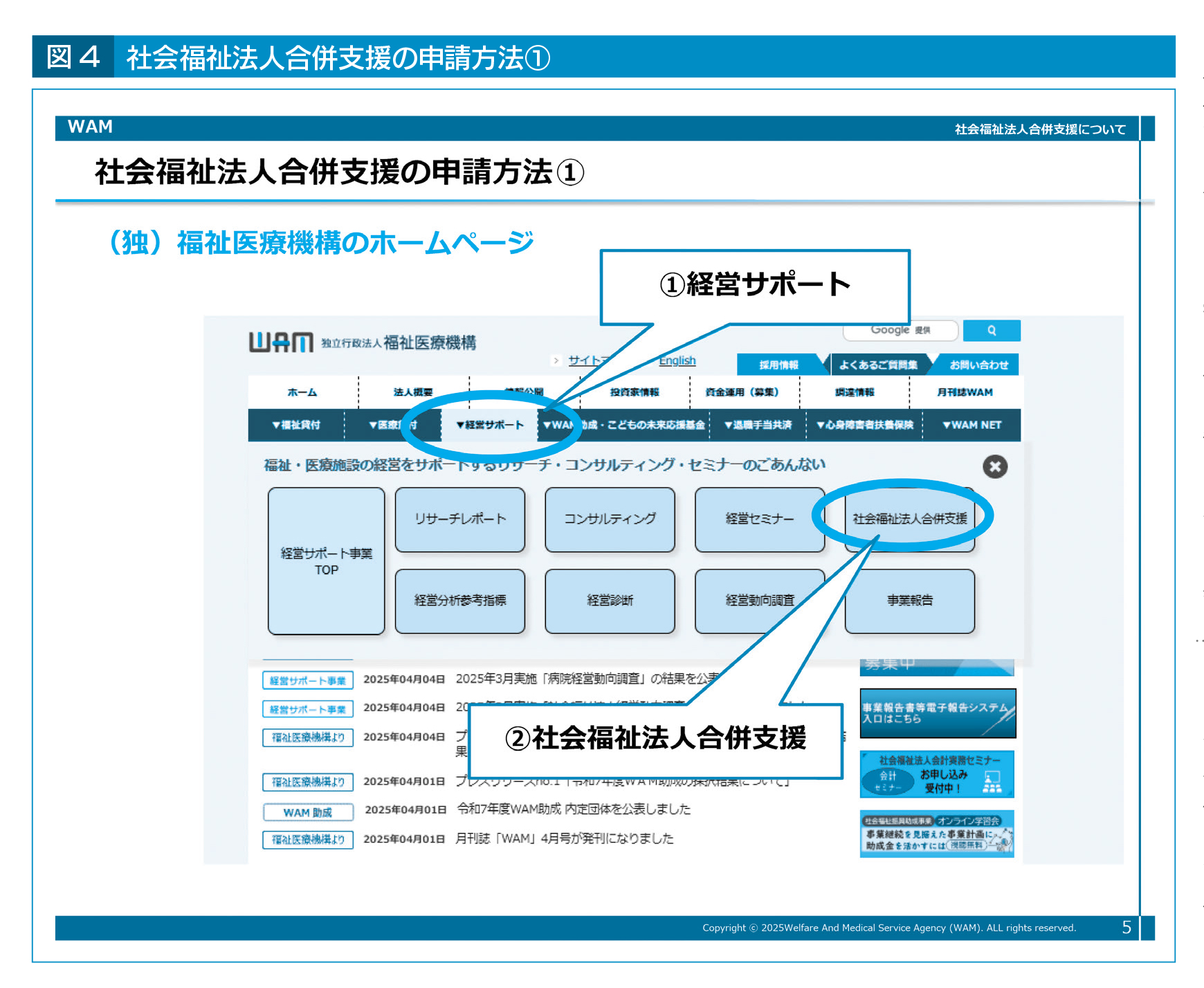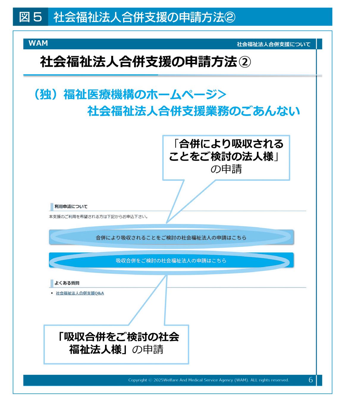 社会福祉法人合併支援の申請は、福祉医療機構のホームページから経営サポート→社会福祉合併支援に進み(図4)、「合併により吸収されることを検討している法人」と「吸収合併を検討している法人」でそれぞれ別のリンク先に進んで申請することとなる(図5)。申し込みは必ず法人の役職員が行う必要があり、役職員ではないコンサルティング会社等が代行して行うことはできない。福祉医療機構のホームページでは、同支援事業のQ&Aも公開している(別掲参照)ので、参考としたい。