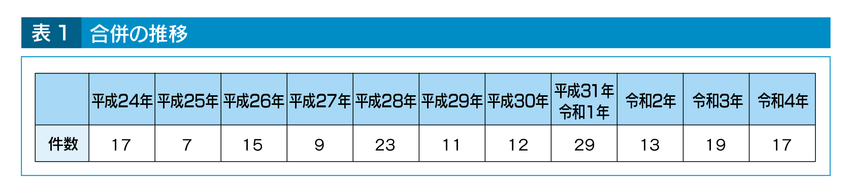 社会福祉法人の合併等については、当然ながら所轄庁の認可が必要となるが、これまでの合併認可件数は、表1の通り、年間10〜20件程度で推移している。このうち、2019(令和元)年度から2022(令和4)年度までに合併の認可実績がある所轄庁数については、所轄庁アンケート調査(回答数=111団体/令和5年度社会福祉推進事業 社会福祉法人の事業譲渡等のあり方に関する調査研究事業)によると、36.9%(41自治体)が「合併認可実績あり」、63.1%(70自治体)が「合併認可実績なし」となっている。また、実績がある場合でも、多くても年に1回程度となっている。「相談されても明確な判断基準がなく、回答に困ることがある」等の回答もあり、所轄庁における指導内容は、合併の目標期日を踏まえ、いつ頃までにどのような書類を準備すればよいか、公告を出すのにどれくらいの時間を取る必要があるか等のスケジュールに関する助言、書類の書き方に関する助言が多くなっている。