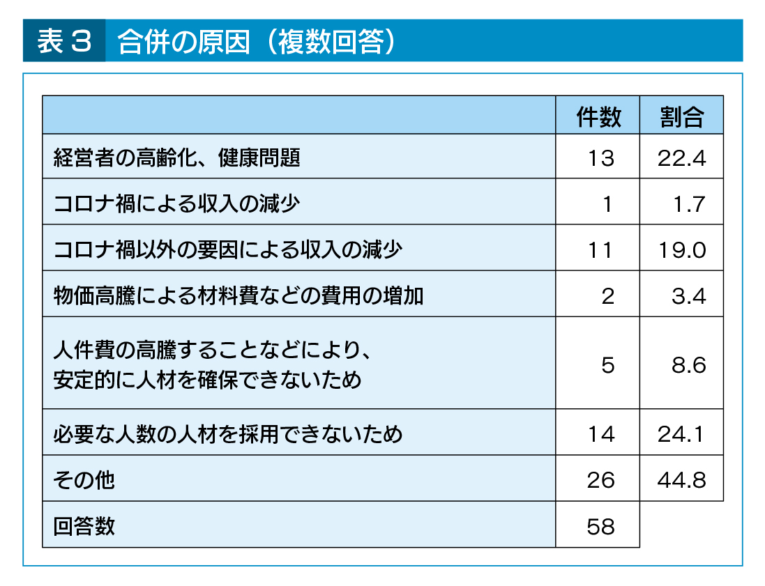 なお、合併認可実績がある41自治体からは、58法人分の詳細について回答が得られ、合併の目的は「財務状況の安定のため(62.1%)」、「人材確保、育成のため(48.3%)」の回答割合が多くなっている(表2)。合併の原因は、「必要な人数の人材を採用できないため(24.1%)」、「経営者の高齢化、健康問題(22.4%)」、「コロナ禍以外の要因による収入減(19.0%)」、の回答割合が多くなっている(表3)。