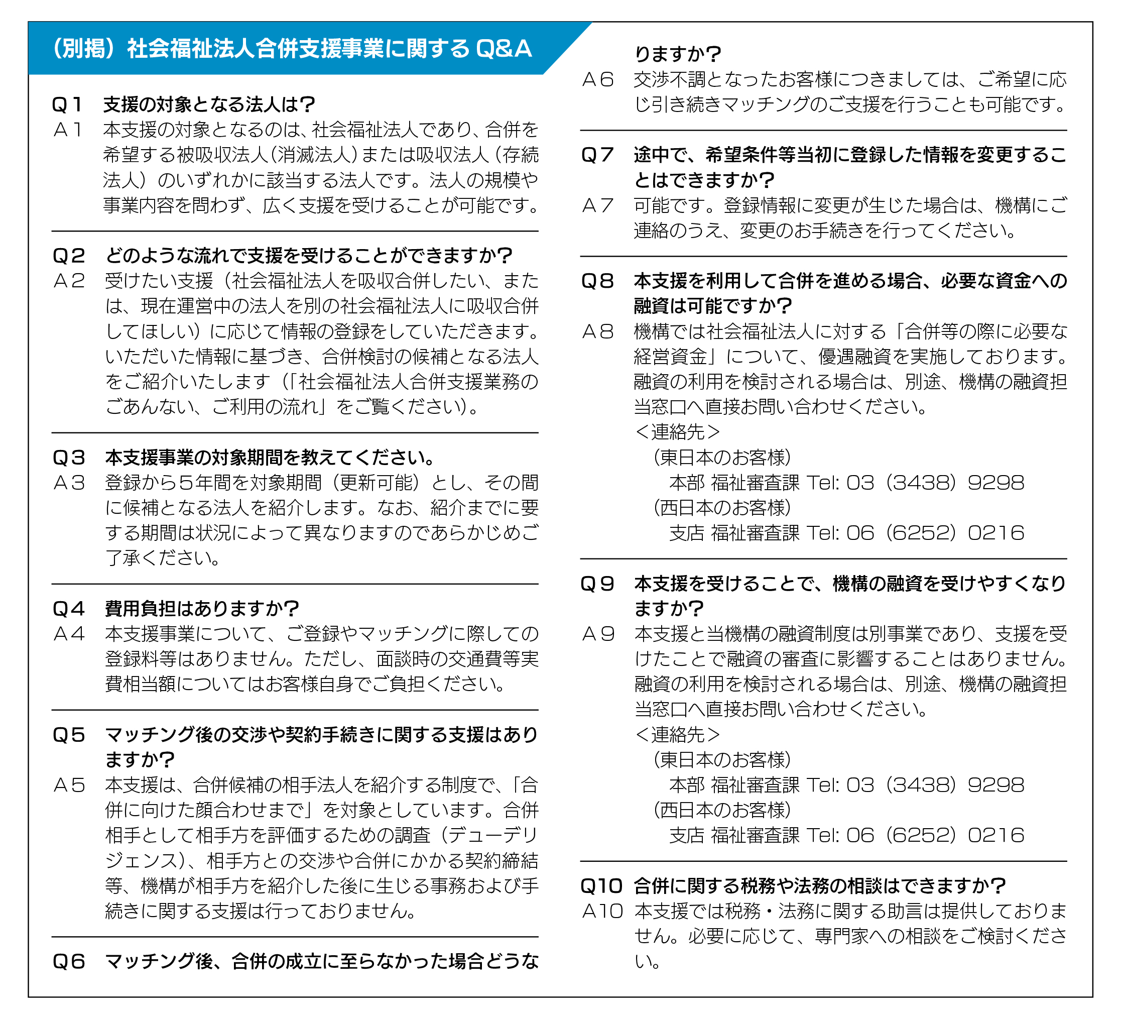 また、2019(令和元)年度の「社会福祉法人の事業拡大等に関する調査研究事業」では、合併や事業譲渡等の「必要性を感じていない」という回答が55.5%(回答法人数=402)と半数を超えていた。しかし、近年の人材確保難や物価上昇、経営層の高齢化等、また小規模事業者ほど収益性・賃金水準・人手確保等が厳しい傾向にあり、事業承継・再編ニーズも増えていることから、「新しい資本主義のグランドデザイン及び実行計画2024年改訂版」が2024(令和6)年6月21日に閣議決定された。この計画には、福祉医療機構による経営支援を進めることが記載されている。