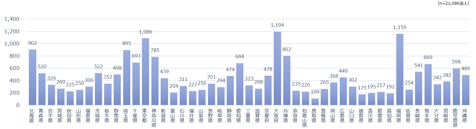 ・ 社会福祉法人の所轄庁から登録のあった社会福祉法人(21,086法人)の基本情報に基づき、その法人数を「所在地(主たる事務所)別」に集計した結果である。