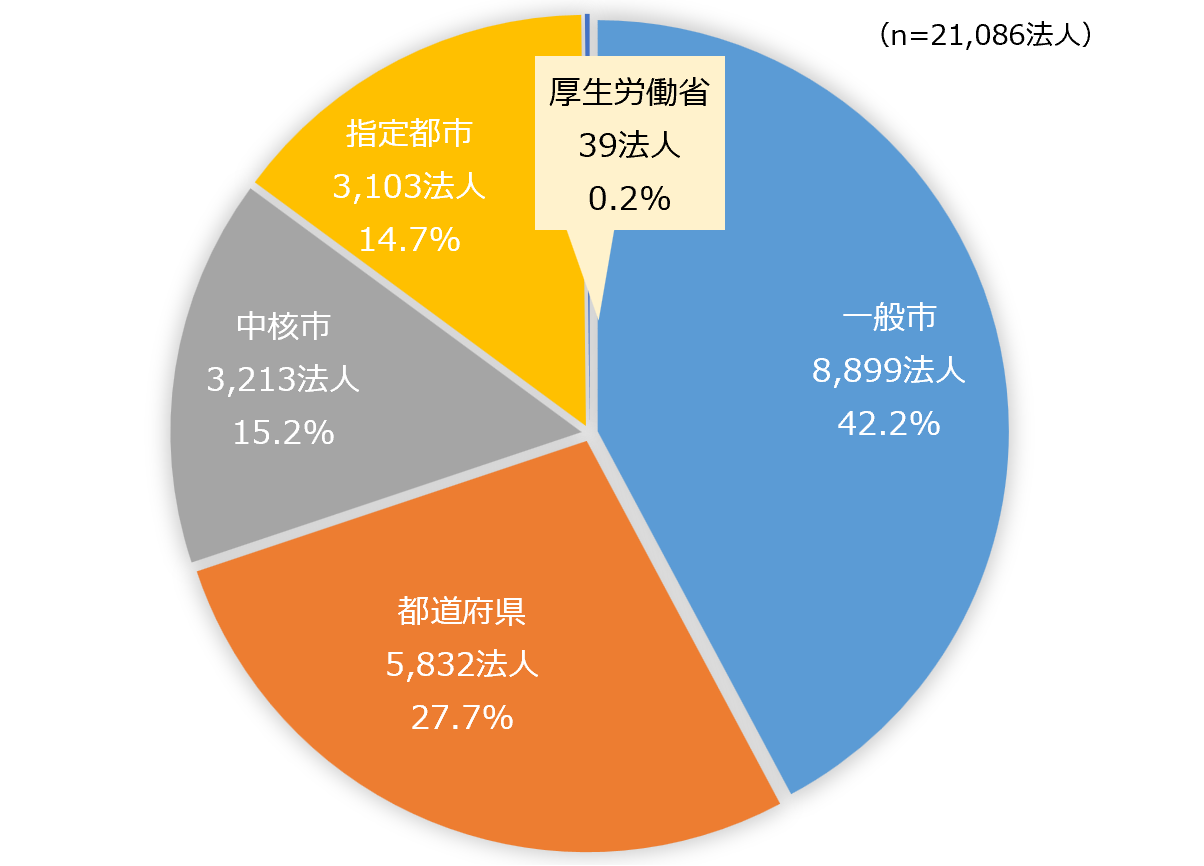 ・ 社会福祉法人の所轄庁から登録のあった社会福祉法人(21,086法人)の基本情報に基づき、その法人数を「所轄庁別」に集計した結果である。