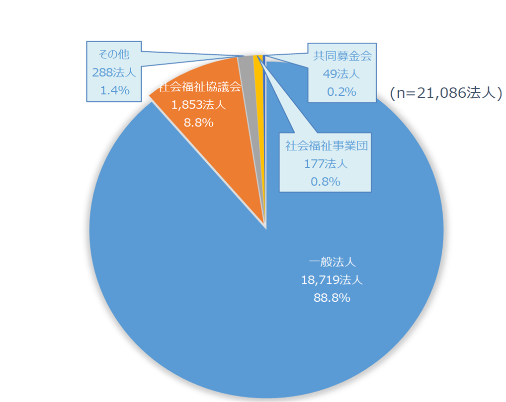 ・ 社会福祉法人の所轄庁から登録のあった社会福祉法人(21,086法人)の基本情報に基づき、その法人数を「法人種別」に集計した結果である。