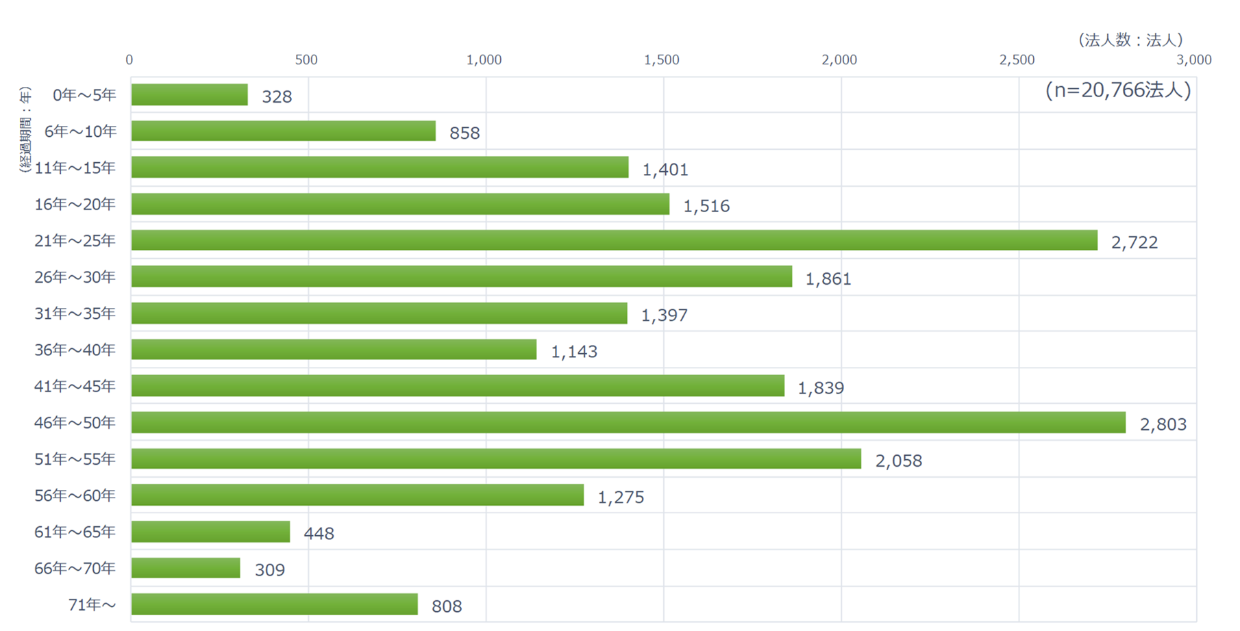 ・ 46年〜50年(2,803法人)が最も多く、次いで、21年〜25年(2,722法人)、51年〜55年(2,058法人)と続いている。