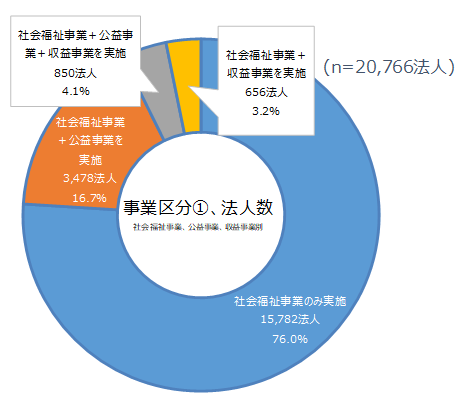 ・ 社会福祉法人の財務諸表等電子開示システムにより、所轄庁に現況報告書等(現況報告書、計算書類及び社会福祉充実計画)の届出を行った社会福祉法人(20,766法人*)の法人数を「事業区分別(社会福祉事業、公益事業、収益事業別)」に集計した結果である。