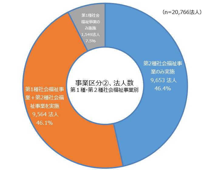 ・ 社会福祉法人の財務諸表等電子開示システムにより、所轄庁に現況報告書等(現況報告書、計算書類及び社会福祉充実計画)の届出を行った社会福祉法人(20,766法人*)の法人数を「事業区分別(第1種社会福祉事業、第2種社会福祉事業別)」に集計した結果である。