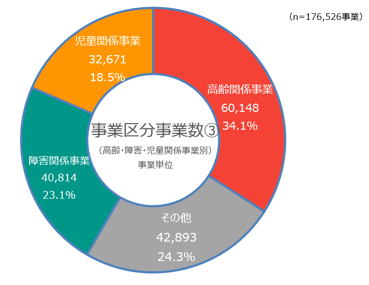 ・ 高齢関係事業(34.1%)が最も多く、次いで、その他(24.3%)、障害関係事業(23.1%)、児童関係事業(18.5%)と続いている。