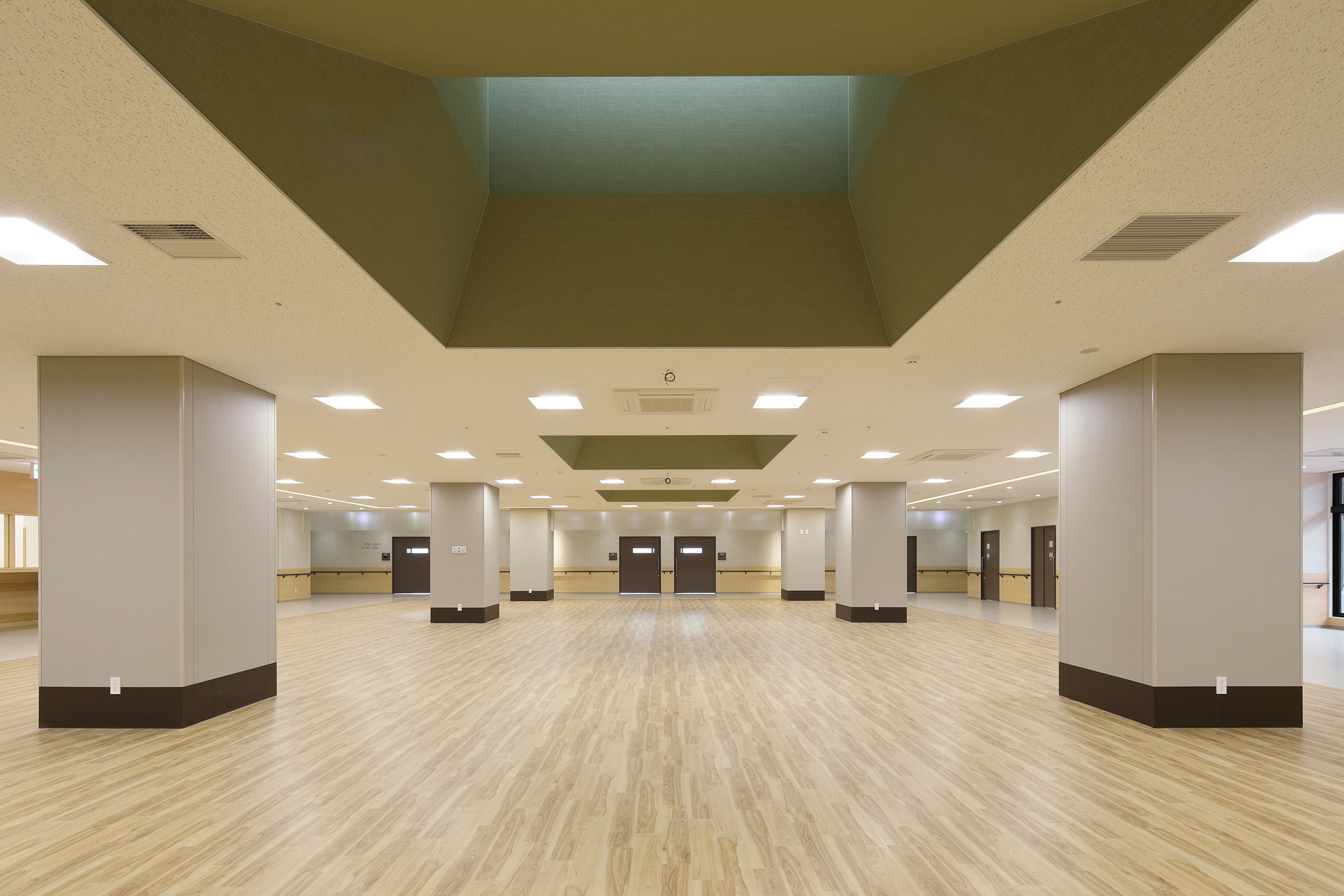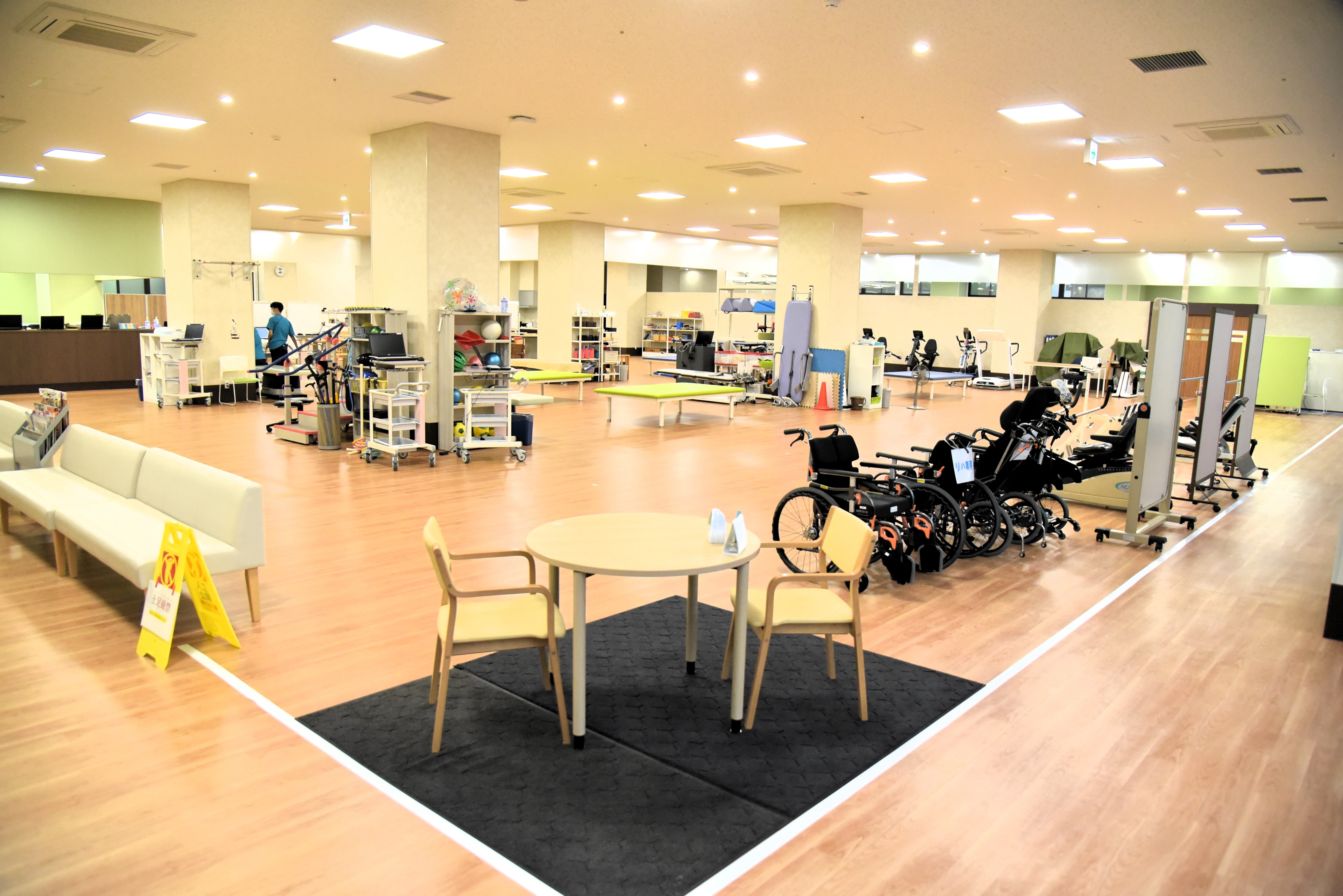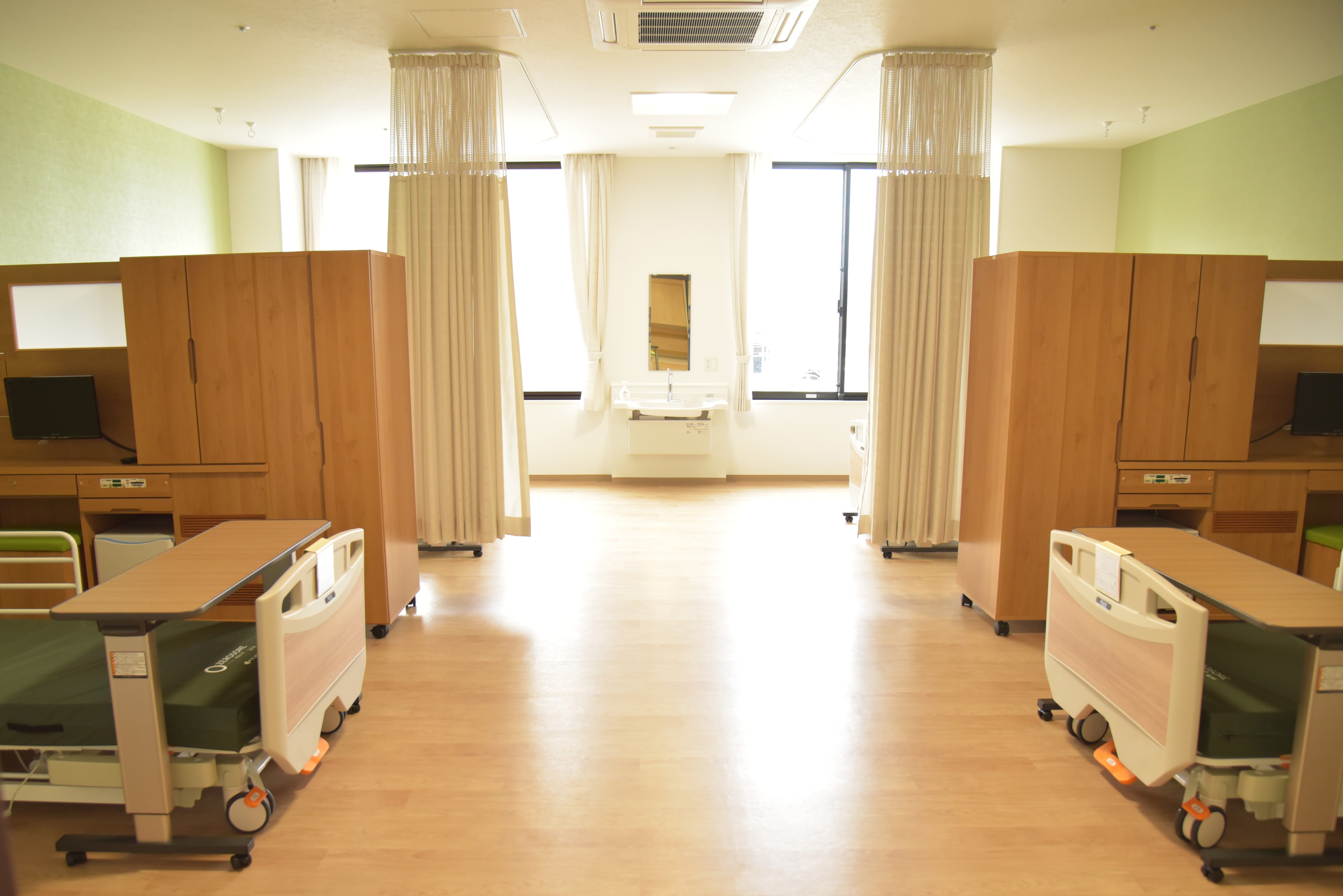 「施設設計の特色としては、2階建てで天井を高くして開放感のある空間をつくり、病室も広い設計にすることで快適な入院環境を提供しています。また、建物全体の横幅は130mと横長の設計とすることで、患者が横移動をする機会を増やし、リハビリテーションや訓練につなげています」。