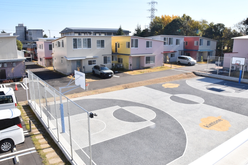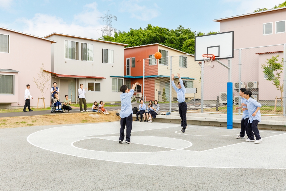「当施設は『高齢者の臨終と子どもの育ちがクロスする』をコンセプトとしており、施設周辺は、自然豊かな公園があり、高校に隣接するなど多様な人たちが行き交う環境があります。施設の周囲にフェンスや塀を設けないことで地域の人たちが気軽に立ち寄れる場所を目指しています。また、地域交流スペースとともに、敷地内には地域の方が誰でも利用できるバスケットコートを設置しました。昼休みや放課後の時間帯には多くの高校生が利用しており、多世代が交流する場面も生まれています」。